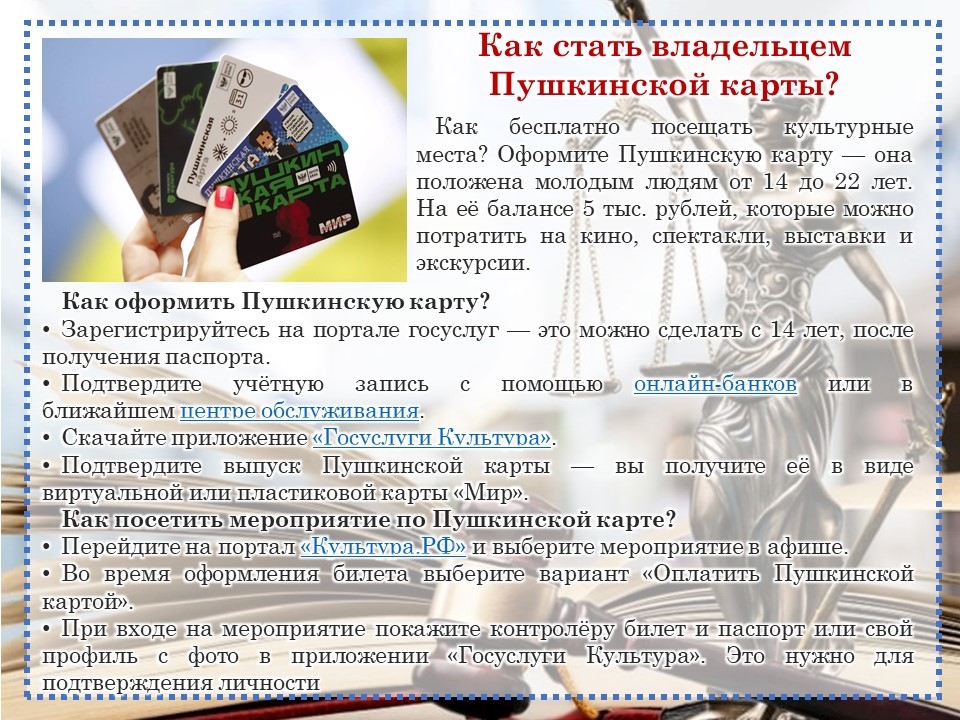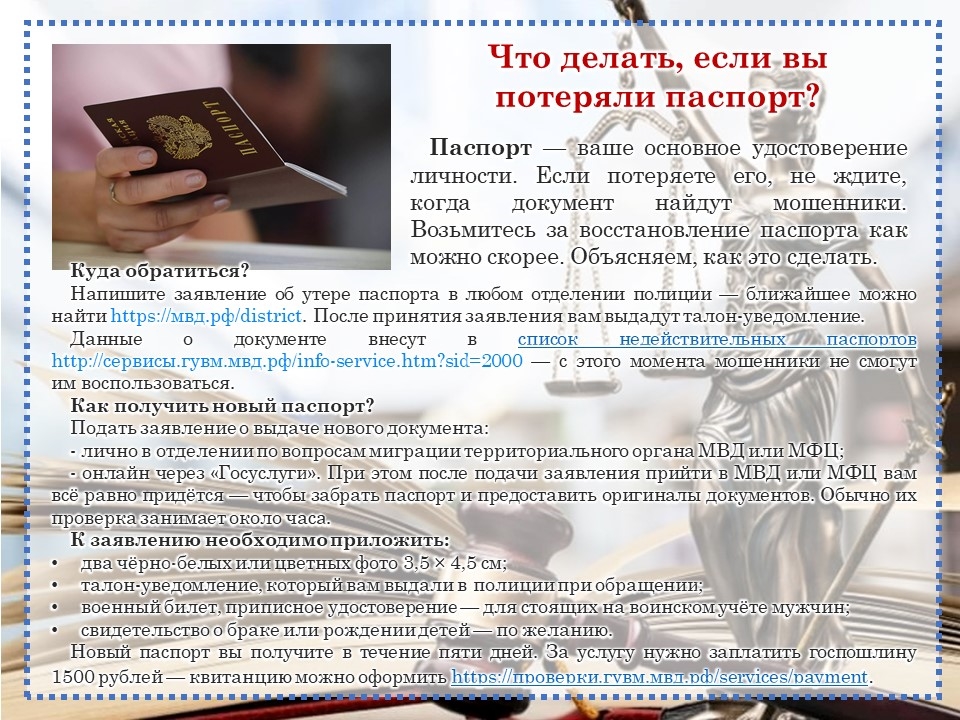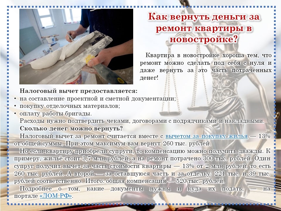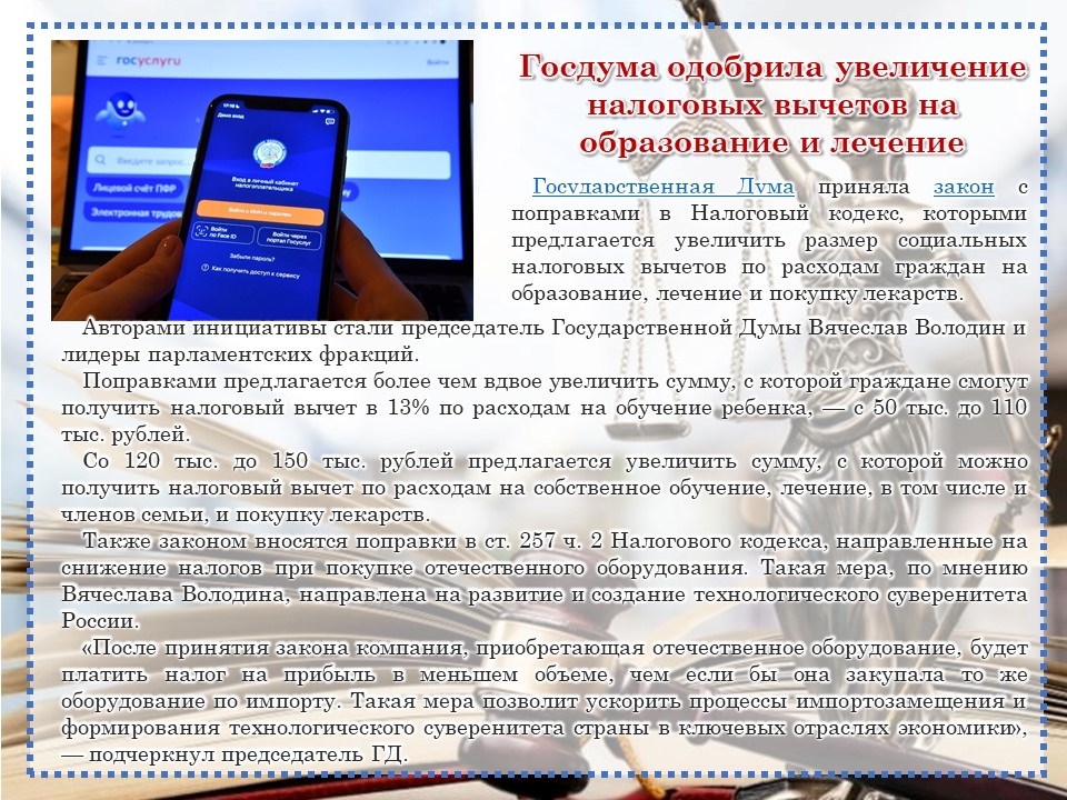 Для более подробного изучения данной темы Центральная библиотека Моргаушского муниципального округа подготовила онлайн-презентацию «Странички юриста». Презентация поможет найти ответы на следующие актуальные вопросы: «Могут ли самозанятые родители оформить единое пособие на детей?», «Что делать, если вы потеряли паспорт?», «Как стать владельцем Пушкинской карты?», «Как получить выписку из ЕГРН онлайн?», «Минцифры: электронные повестки не рассылаются через «Госуслуги», «Госдума одобрила увеличение налоговых вычетов на образование и лечение», «Как вернуть деньги за ремонт квартиры в новостройке?», «Как вернуть деньги за билет на концерт?», «Весенний пал: почему нельзя жечь сухую траву?».